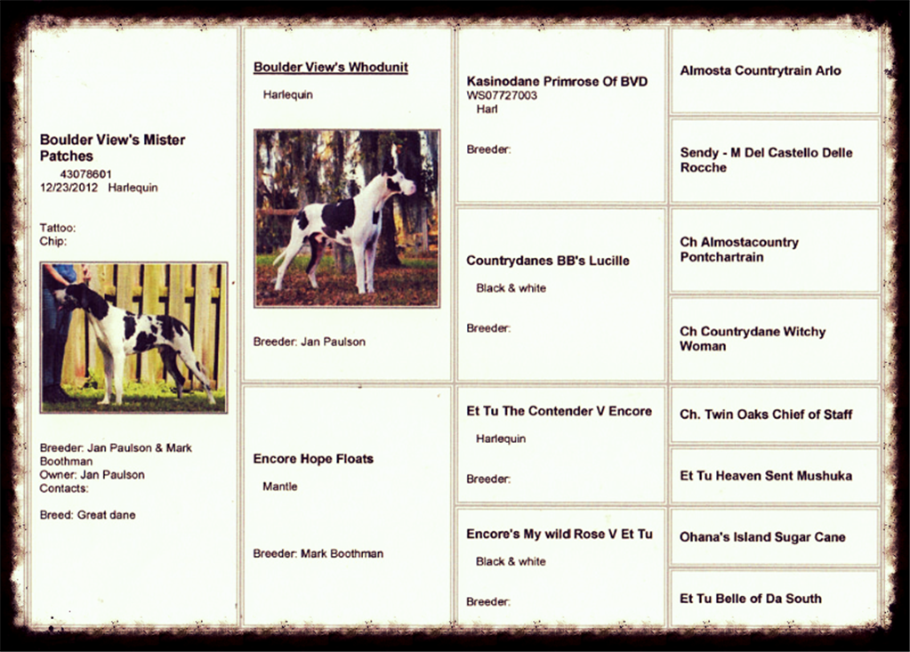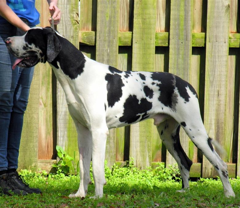The only thing that is more tremendous than Mr. Patches' bone & size, is his heart! He is one of the biggest & mushiest Danes I have ever known! His color is just beautiful & when he is finally mature, we believe that he is going to be quite the looker. Thanks to Mark Boothman for letting his Encore Hope Floats ( Bernice) produce this wonderful litter for us!